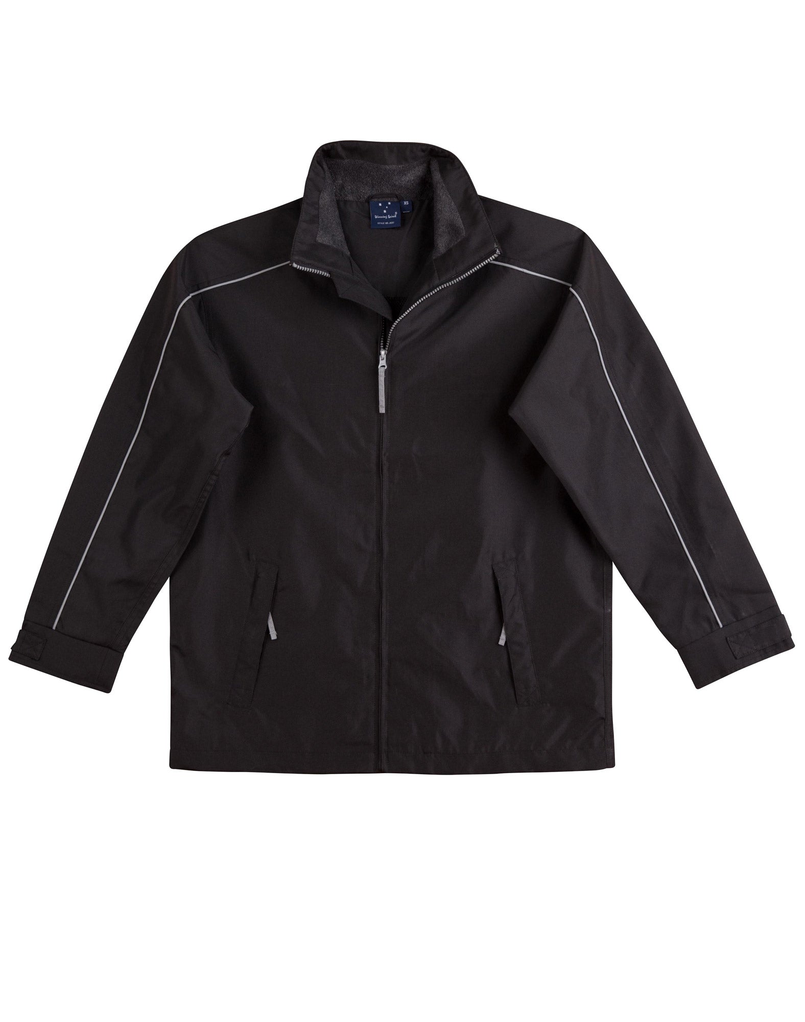 - Fabric: Oxford, Mesh Lining 155gsm - 100% Polyester, Description: Water repellent Oxford shell jacket with silver reflective piping, charcoal colour fleece lined collar, inside mesh lining
